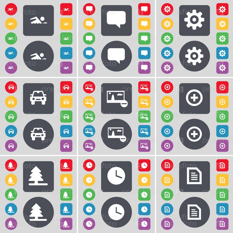 Пловец, чат пузырь, снаряжение, автомобиль, фотография, плюс, елочка, часы, значок символ. Большой набор плоских, цветные кнопки для вашего дизайна. Вектор
