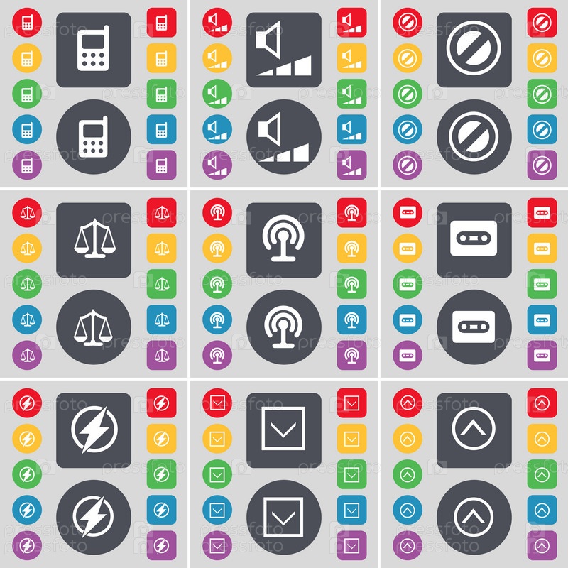 Мобильный телефон, объем, остановка, весы, Wi-Fi, кассеты, флэш, символ значка стрелки. большой набор плоских цветных кнопок для вашего дизайна. вектор