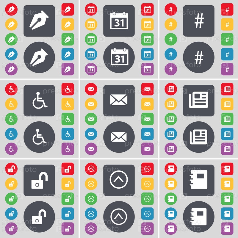 Чернил горшка, календарь, хэш тег, инвалид, сообщение, газета, замок, стрелка вверх, Блокнот значок символа. Большой набор плоских, цветные кнопки для вашего дизайна. Вектор