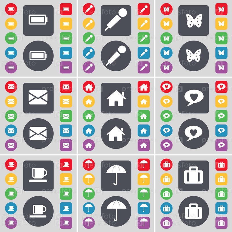Аккумулятор, микрофон, Бабочка, сообщение, дом, чат пузырь, Кубок значок символа. Большой набор плоских, цветные кнопки для вашего дизайна. Вектор