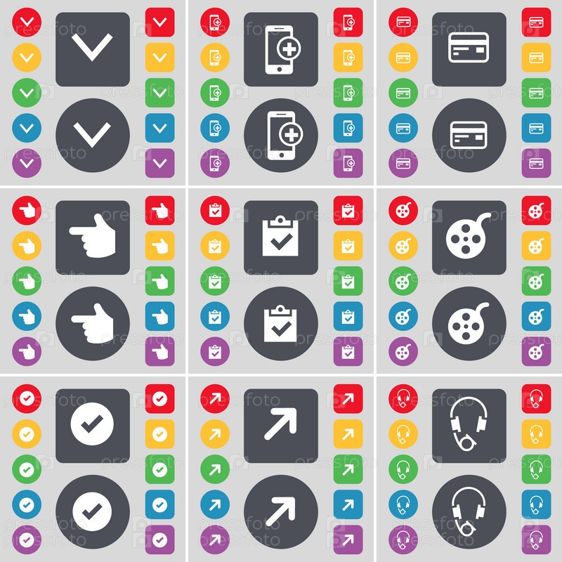 Стрелка вниз, смартфон, кредитная карта, рука, обследования, видеозапись, тик, полный экран, наушники значок символ. Большой набор плоских, цветные кнопки для вашего дизайна. Вектор