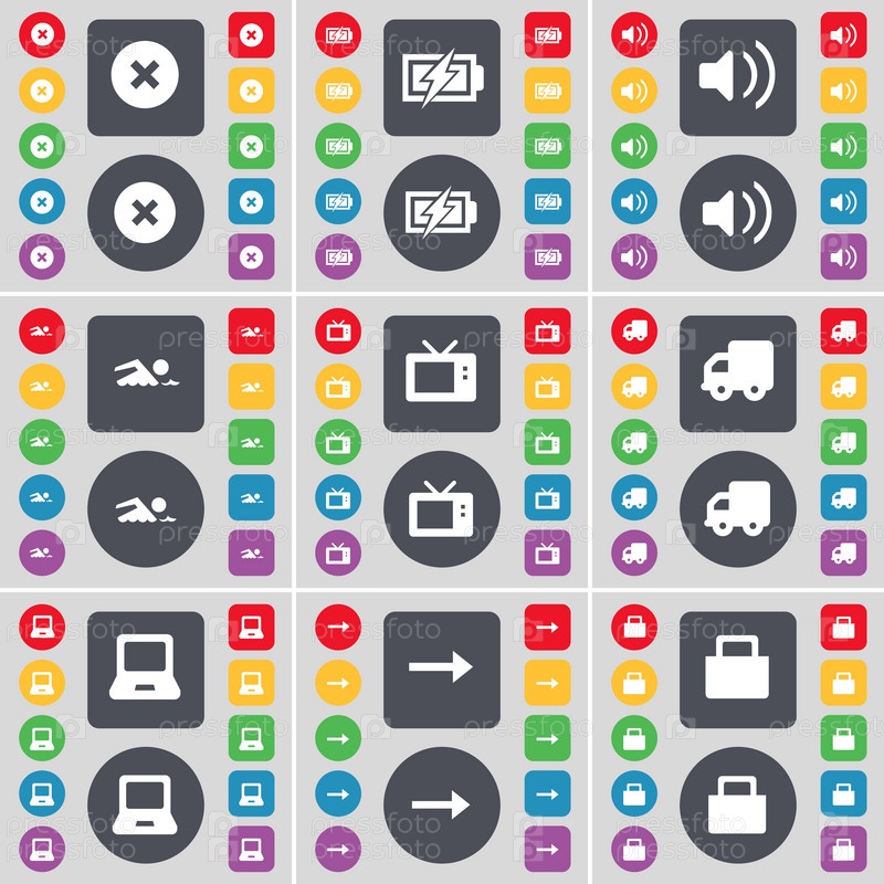 Стоп, зарядка, звук, плаватель, ретро-ТВ, грузовик, ноутбук, символ r иконки. большой набор плоских цветных кнопок для вашего дизайна. вектор