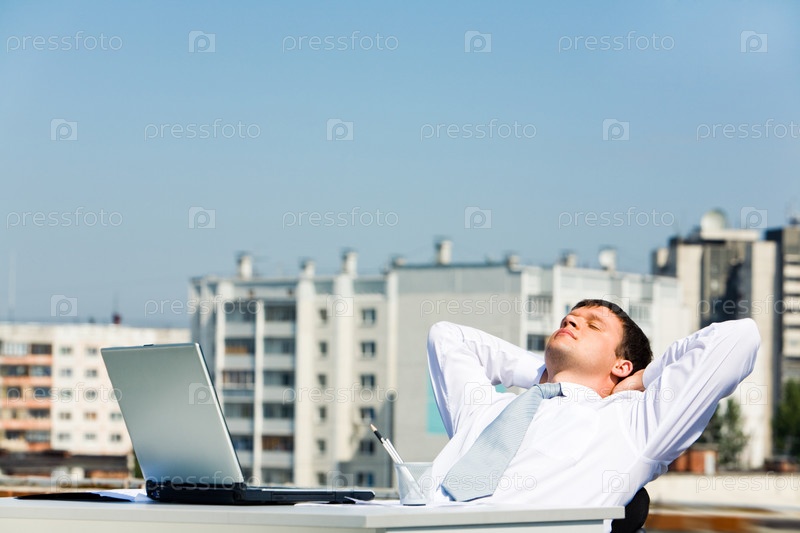 Изображение расслабленного мужчины, сидящего за столом с руками за головой и закрытыми глазами