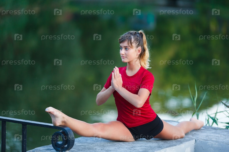 Симпатичная молодая девушка делает упражнения йоги