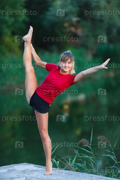 Симпатичная молодая девушка делает упражнения йоги