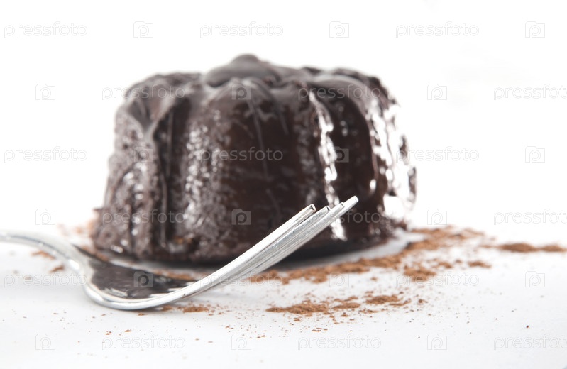 Шоколадный торт и вилка на белом фоне
