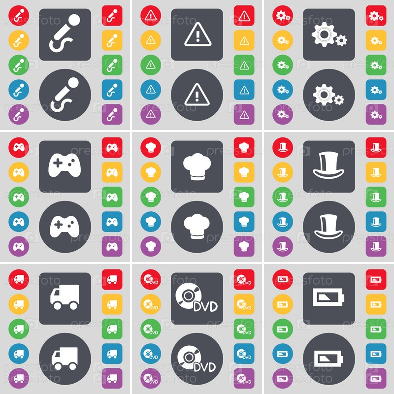 Микрофон, предупреждение, оборудование, геймпад, шляпа для приготовления пищи, шелковая шапка, грузовик, DVD, значок символа батареи Большой набор плоских цветных кнопок для вашего дизайна. вектор