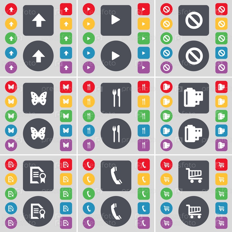 Стрелка вверх, средства массовой информации играть, стоп, Бабочка, вилка и нож, негативных пленок, текстовый файл, приемник, торговых тележка значок символа. Большой набор плоских, цветные кнопки для вашего дизайна. Вектор