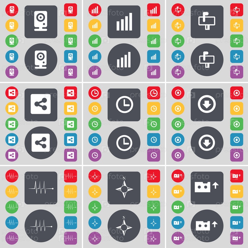 Спикер, диаграмма, почтовый ящик, доля, часы, стрелка вниз, пульс, компас, кассета значок символа. Большой набор плоских, цветные кнопки для вашего дизайна. Вектор