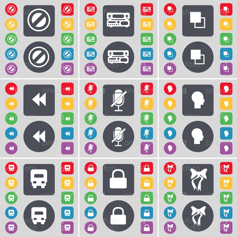 Остановить, воспроизвести, скопировать, перевернуть, микрофон, силуэт, грузовик, замок, значок символа лука. большой набор плоских цветных кнопок для вашего дизайна. вектор