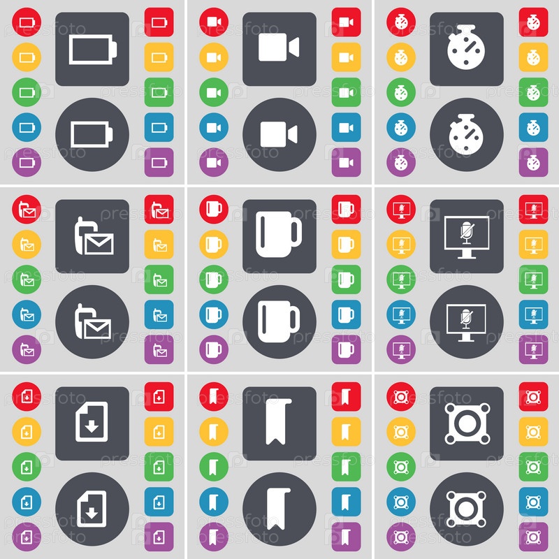 Аккумулятор, пленочная камера, секундомер, SMS, Кубок, монитор, файл, маркер, Спикер Иконка символа. Большой набор плоских цветных кнопок для вашего дизайна