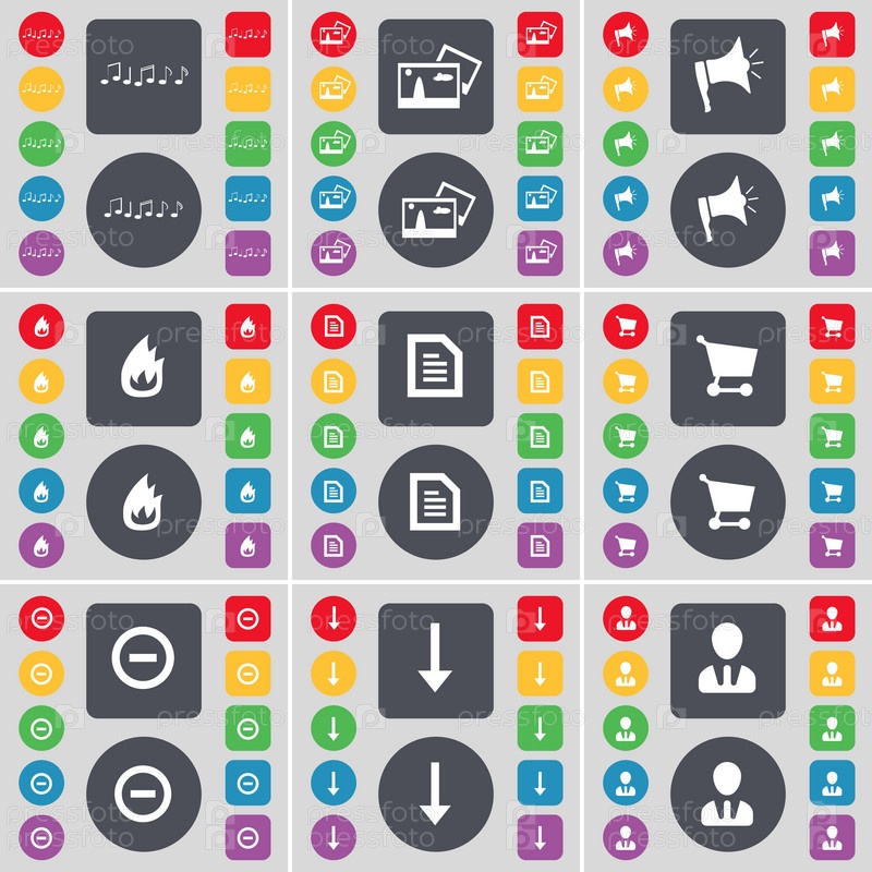 Примечание, картинка, Мегафон, огонь, текстовый файл, корзина, минус, стрелка вниз, аватар значок символа. Большой набор плоских, цветные кнопки для вашего дизайна. Вектор