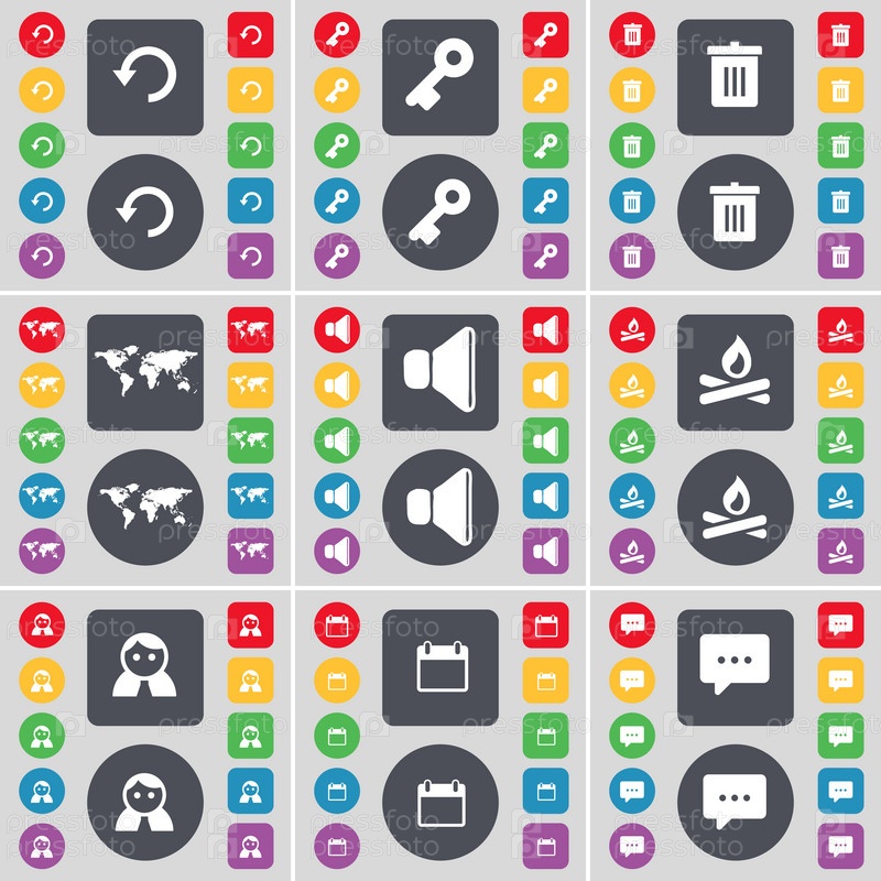 Перезагрузка, ключ, мусор может, глобус, звук, у костра, аватар, календарь, чат пузыря значок символа. Большой набор плоских, цветные кнопки для вашего дизайна. Вектор