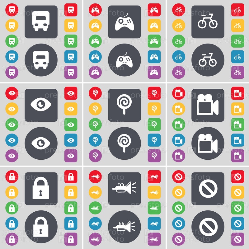 Грузовик, геймпад, велосипеды, видение, конфетка, пленочная камера, замок, Trumped, значок символа остановки. большой набор плоских цветных кнопок для вашего дизайна. вектор