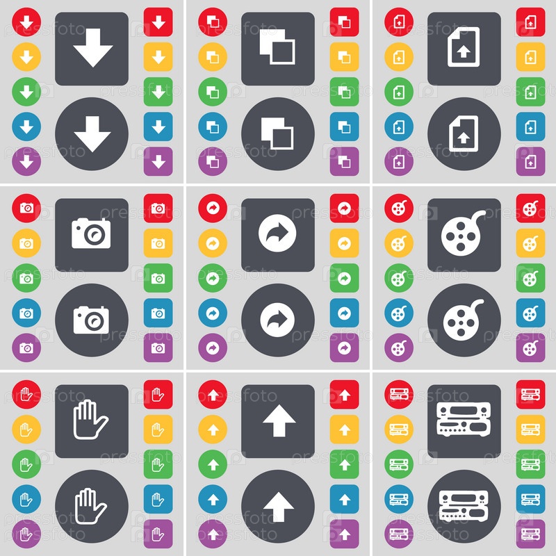 Стрелка вниз, копировать файл, камеры, обратно, видеозапись, рука, стрелка вверх, рекорд плеер значок символа. Большой набор плоских, цветные кнопки для вашего дизайна. Вектор