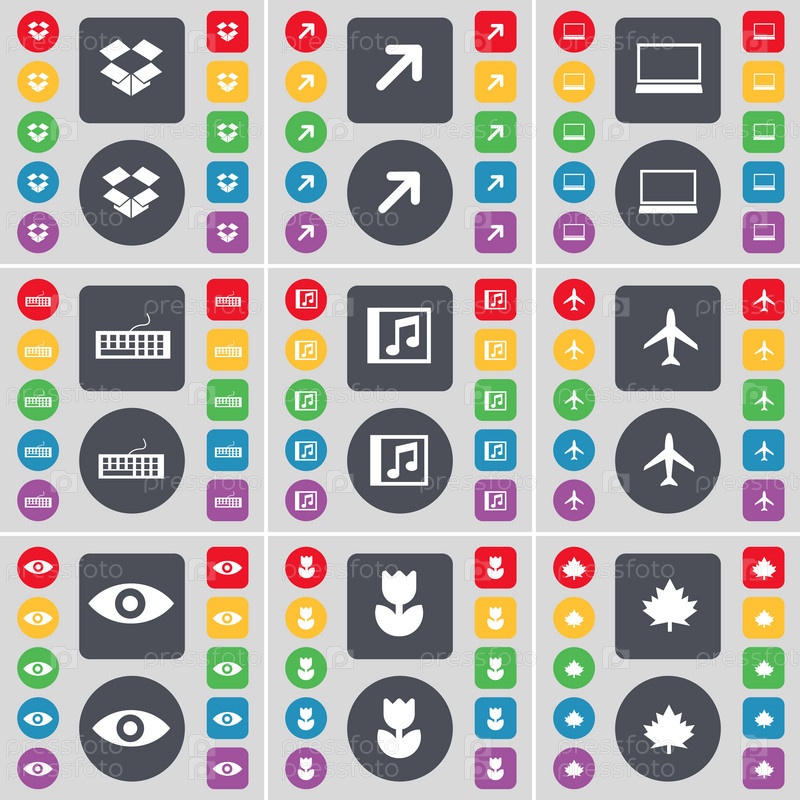 Ящик, полный экран, ноутбук, клавиатура, окна музыки, самолет, видение, цветок, кленовый лист значок символа. Большой набор плоских, цветные кнопки для вашего дизайна. Вектор