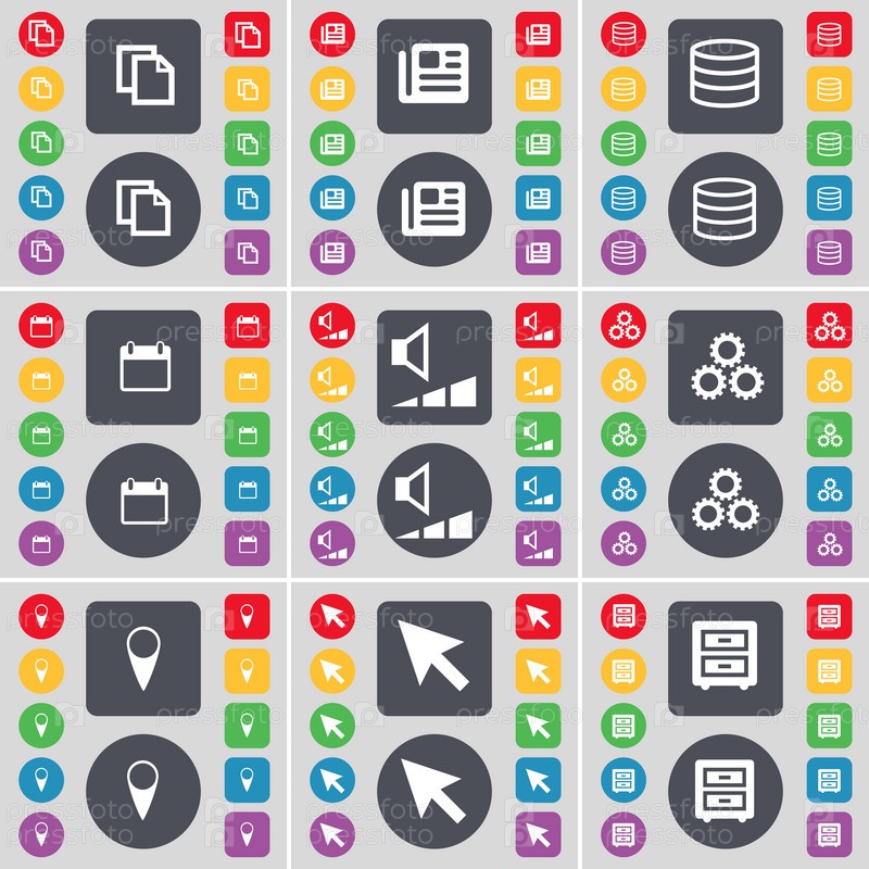 Копирование, газета, базы данных, календарь, объем, снаряжение, контрольно-пропускной пункт, курсор, тумбочка значок символа. Большой набор плоских, цветные кнопки для вашего дизайна. Вектор
