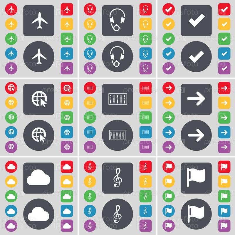 Самолет, наушники, тик, веб курсора, эквалайзер, стрелка вправо, облако, скрипичный ключ, символ значок флага. Большой набор плоских, цветные кнопки для вашего дизайна. Вектор