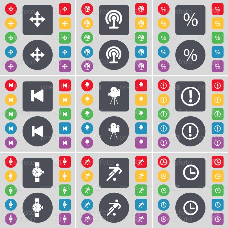 Перемещение, Wi-Fi, процент, Скип медиа, пленочная камера, восклицательный знак, наручные часы, футбол, иконка символа часов Большой набор плоских цветных кнопок для вашего дизайна. вектор