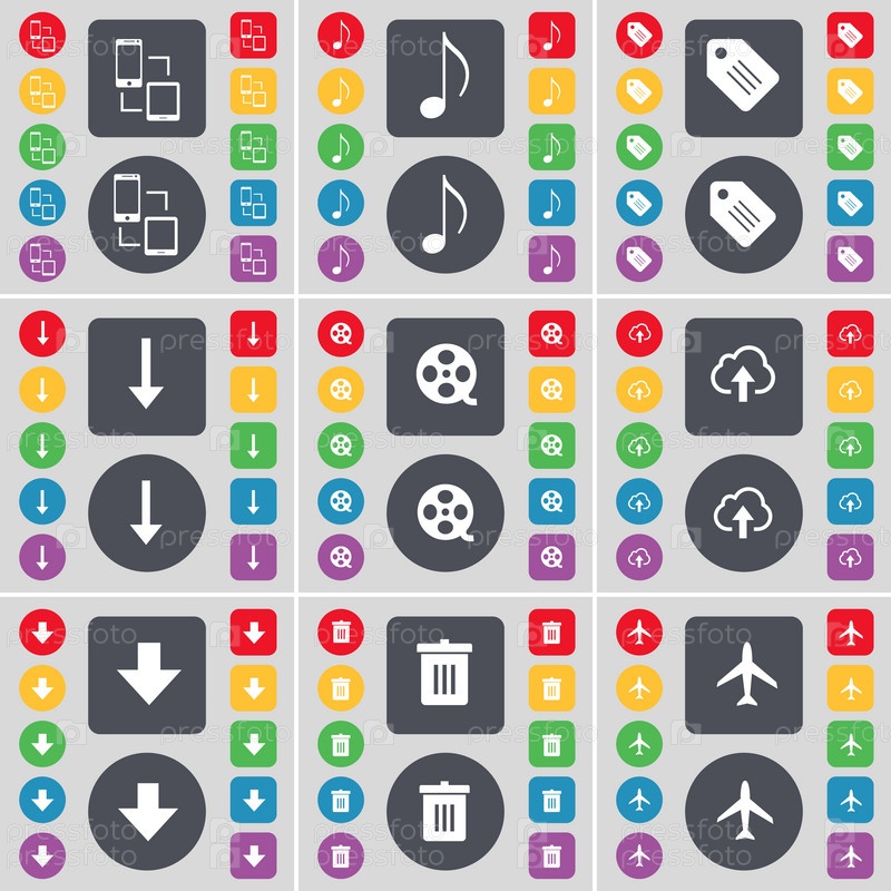 Подключение, Заметим, тег, стрелка вниз, видеозапись, облако, стрелка вниз, мусорный бак, самолет значок символа. Большой набор плоских, цветные кнопки для вашего дизайна. Вектор