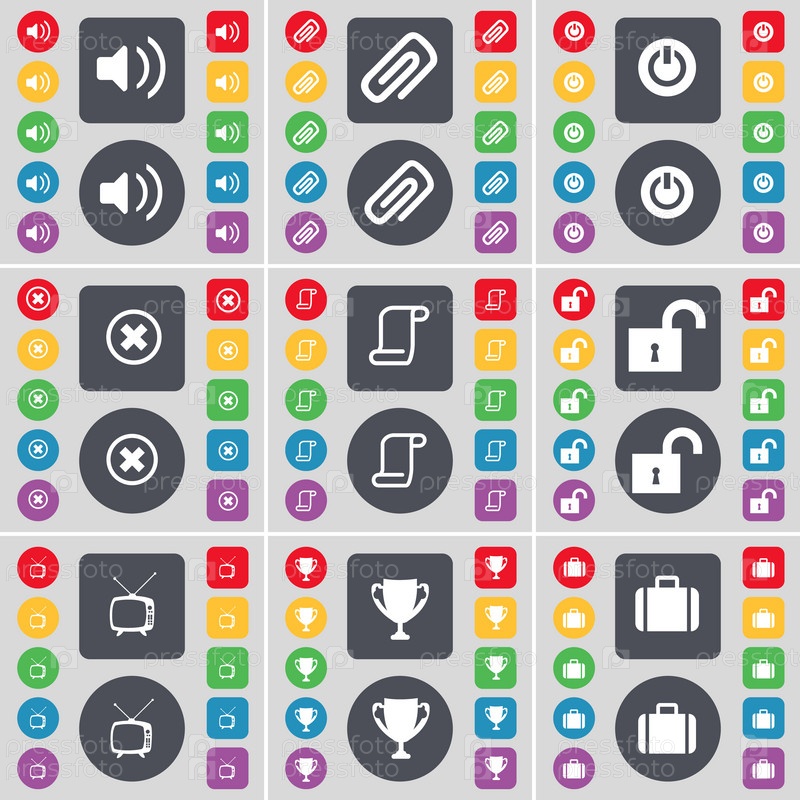 Звук, клип, питания, остановка, прокрутки, замок, Ретро ТВ, Кубок, чемодан значок символа. Большой набор плоских, цветные кнопки для вашего дизайна. Вектор