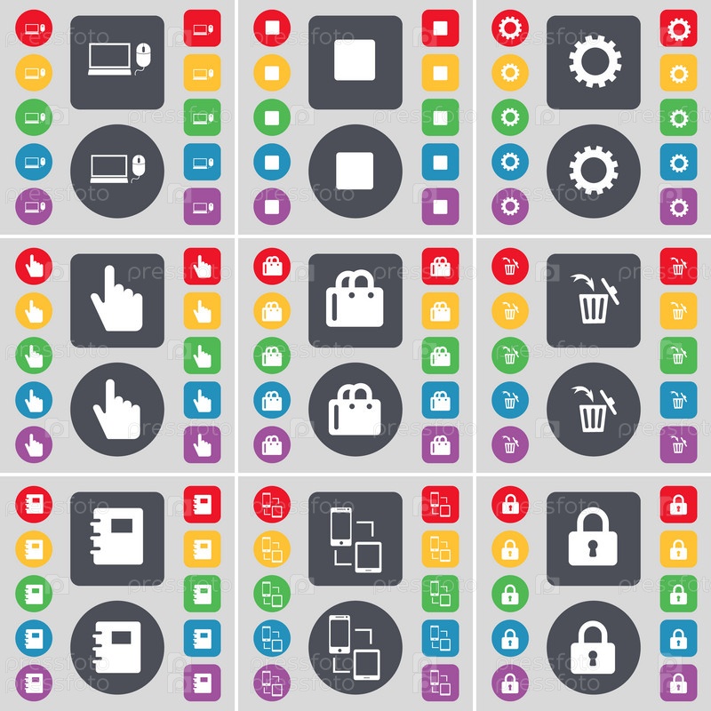 Ноутбук, медиа-дисплей, Гир, рука, корзина, мусорный бак, ноутбук, связь, символ иконы замка. Большой набор плоских цветных кнопок для вашего дизайна. вектор
