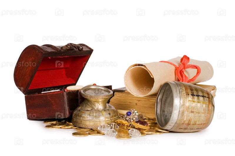 Свиток, книга, старинный сундучок, золотые монетки и драгоценные чаши на белом фоне