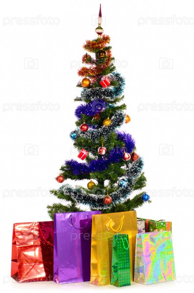 Пакеты с подарками под украшенной новогодней елкой