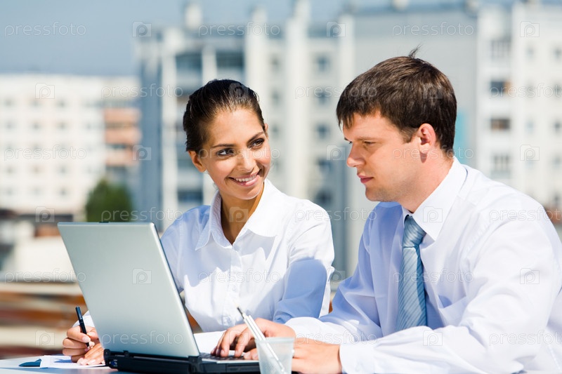 Портрет двух деловых партнеров, работающих снаружи на фоне домов