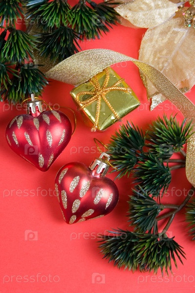 Сосновые веточки и новогодние украшения на розовом фоне