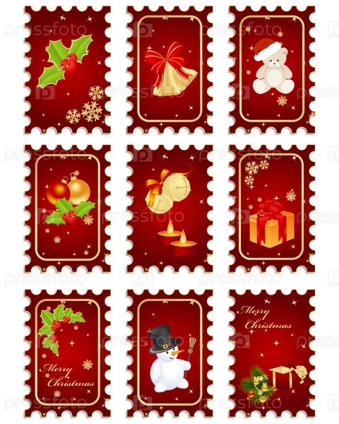 Марки на новогоднюю тему, изолированы на белом фоне