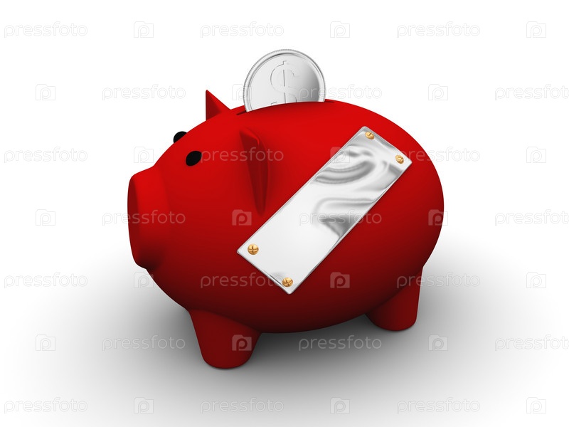 Красная свинья-копилка с деньгами на белом фоне