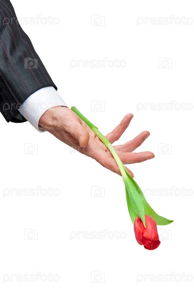 Красный тюльпан в мужской руке на белом фоне