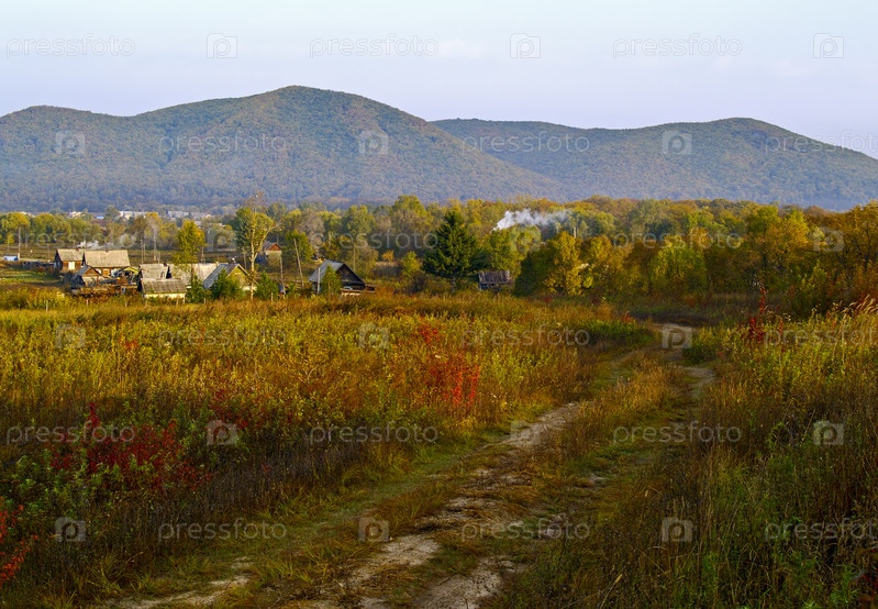 Осенний пейзаж, проселочная дорога, деревня и горы