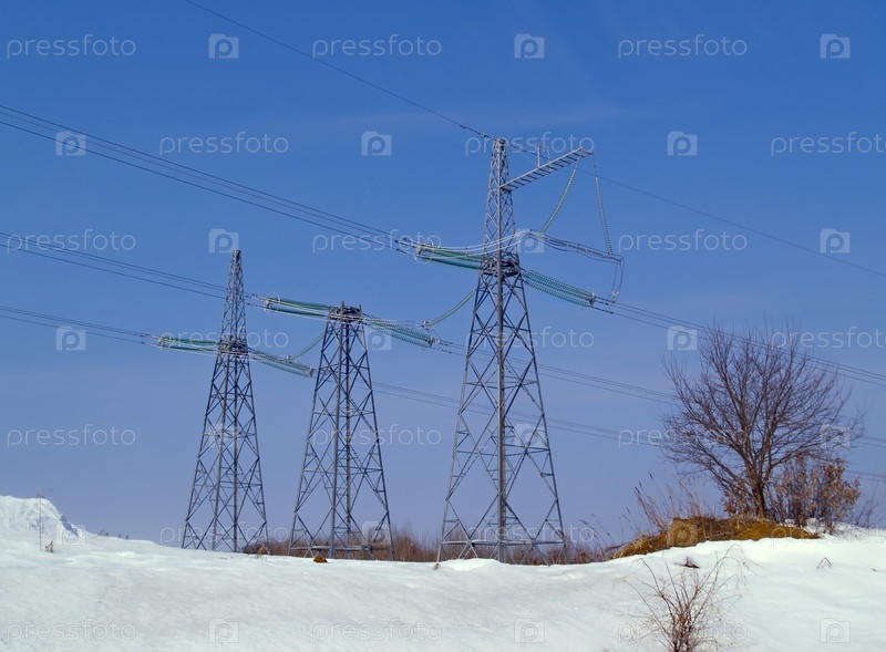 Высоковольтные линии электропередач на фоне голубого неба, зимнее время