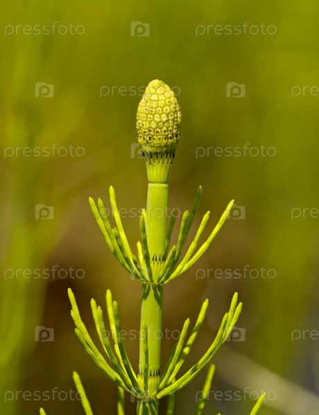 Молодой побег хвоща на размытом зеленом фоне