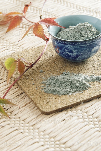 Голубая глина в порошке в голубой фарфоровой пиале