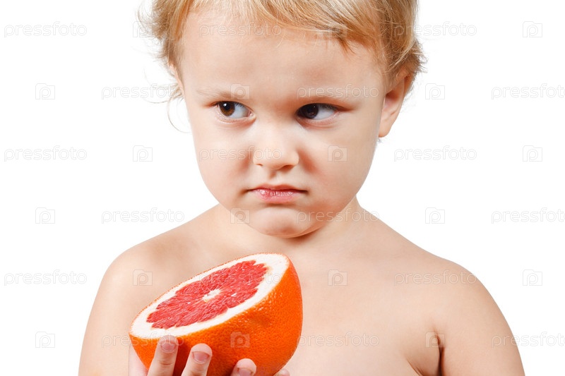 Маленький мальчик с разрезанным грейпфрутом на белом фоне