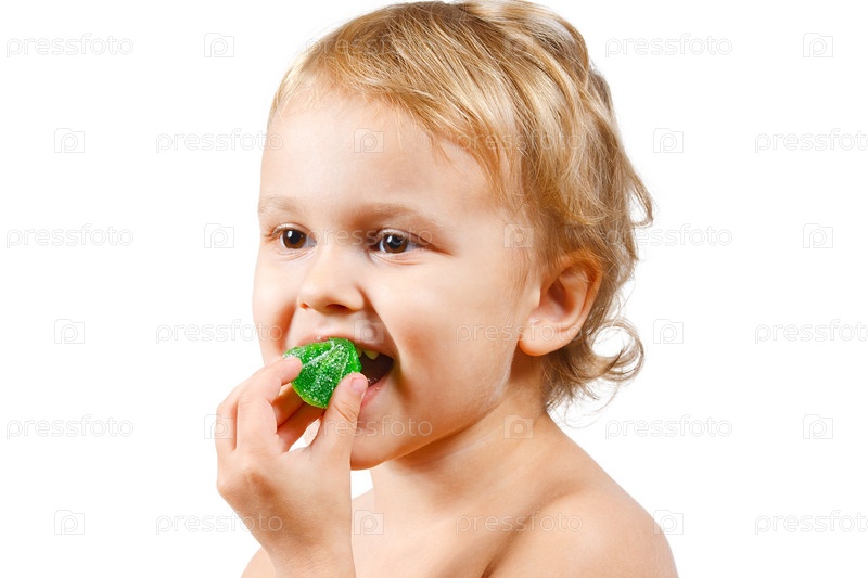 Маленький мальчик ест мармелад на белом фоне
