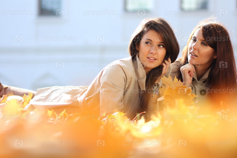 Привлекательные девушки лежат в осенней листве