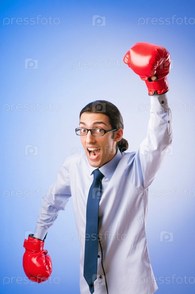Мужчина в боксерских перчатках на голубом фоне