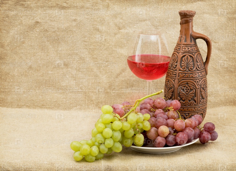 Керамическая бутылка коричневого цвета, виноград и красное вино на выпивке