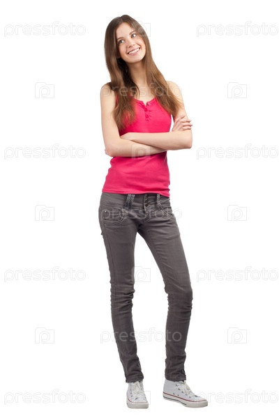 Портрет красивой улыбающейся девушки в повседневной одежде со скрещенными на груди руками