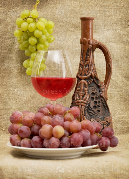 Керамическая бутылка коричневого цвета, виноград и красное вино на выпивке