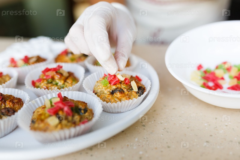 Молодая женщина надевает цукаты торты