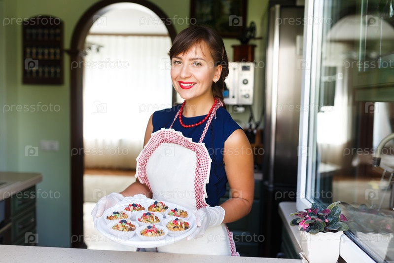 Молодая женщина держит поднос с кексы