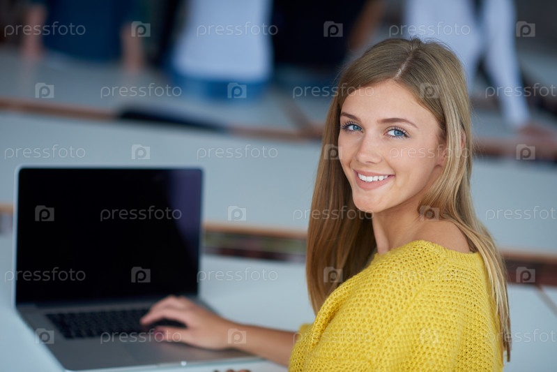 Портрет девушки студент счастливый улябающиеся в классе технология