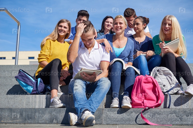 Студенты за пределами сидя на шагах
