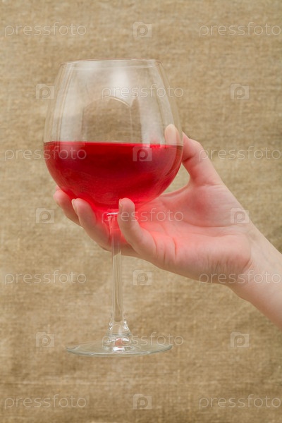 Винный бокал с вином на женской руке холст фоне