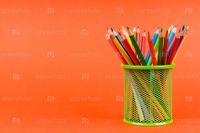 Карандаши в стакане на оранжевом фоне